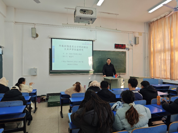 2024年11月28日下午16时,世俱杯中国官网入口施雪军博士在4号教学楼4203教室举办了学术讲座,报告题目为《环氧树脂基复合材料的制备及其声学性能研究》,世俱杯官网22级材料科学与工程专业的学生聆听了本次报告。