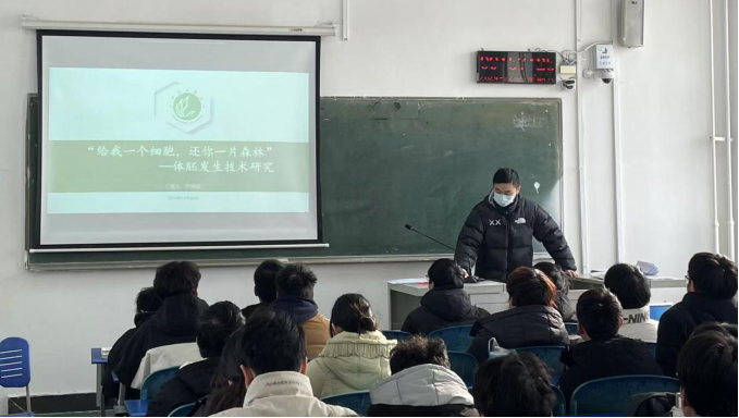 齐帅征博士结合自己的教学经验和科研实践,从环境生态专业角度详细地介绍了体胚发生技术,强调其作为植物细胞全能性的完美体现,是植物组织培养中的一个重大发现和突破。它利用植物体细胞的再分化能力,通过适宜的人工培养条件,使已分化的体细胞改变原有的发育模式,经历脱分化和再分化,最终发育成完整植株。这一技术不仅为林木的良种繁殖和工业化生产提供了高效途径,还为实现植物资源的可持续利用和保护提供了有力支持。报告最后,齐帅征博士根据自己科研合作经历从专业角度介绍了体胚发生技术的综合利用,提高了同学们对生命科学的认识。