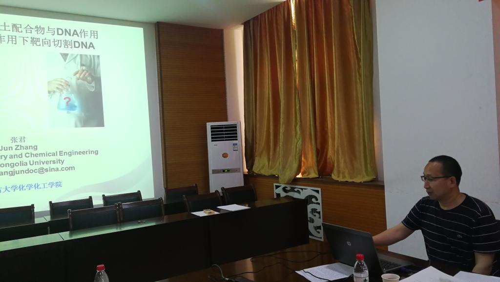 5月25日上午,内蒙古大学化学化工学院博士生导师张君教授应邀为世俱杯官网师生作了《氨基酸衍生物稀土配合物与DNA作用及在识别片段作用下靶向切割DNA》的学术报告。世俱杯官网教师及部分研究生代表聆听了报告。