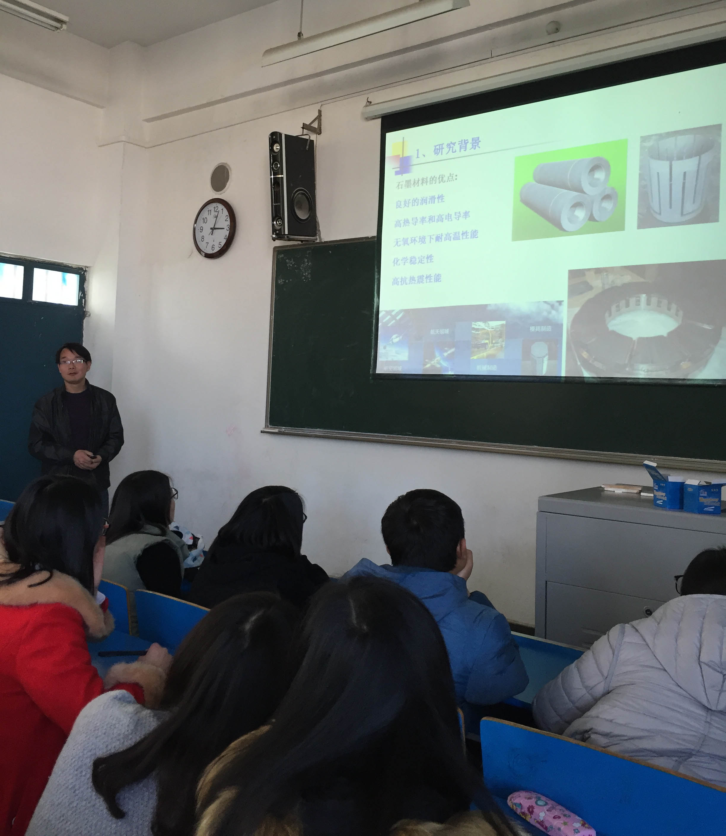 讲座中,韩老师先陈述了此次研究的背景,从石墨的结构引出石墨材料“高抗热震性能、高热导率和高电导率”等性能。随后又从身边小事,向大家讲述了石墨的一些应用。如:家里锁坏了人们会用一些铅笔末,也就是石墨来做"润滑剂"讲起,使同学们容易认识到石墨在我们生活中的作用。重点介绍了碳化硅增强石墨复合材料的制备工艺、性能以及应用。通过幽默风趣的语言,使刚开始接触材料学的同学们大开眼界。