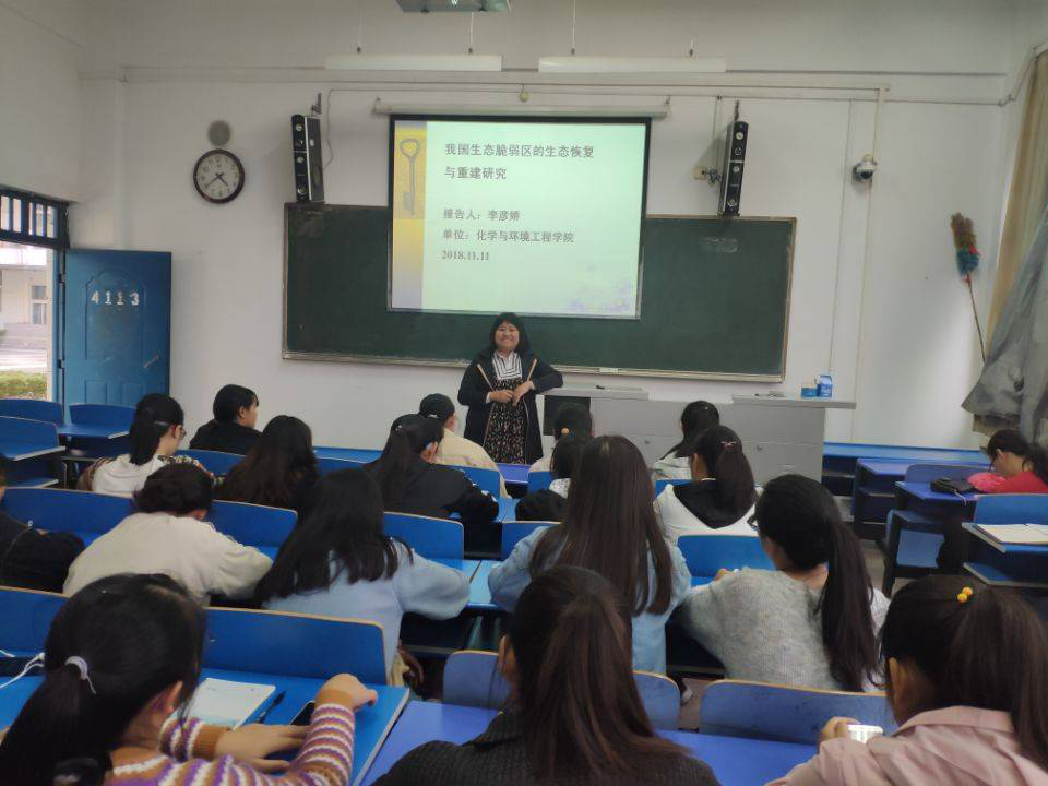 随后,李彦娇老师进行了另一个主题的学术报告。李彦娇老师首先进行了精彩的自我介绍,李老师风趣的语言与丰富的考察经验获得了同学们的阵阵掌声。紧接着李彦娇老师向同学们讲述了我国生态脆弱区的类型、生态脆弱区的普遍特征、山地退化生态系统的恢复与重建三个方面的知识。同学们认真聆听,积极响应。最后,同学们以热烈的掌声感谢佟伟霜与李彦娇博士进行本次学术报告,并欢送两位老师离场。报告会在同学们的热烈掌声中画上了圆满的句号。