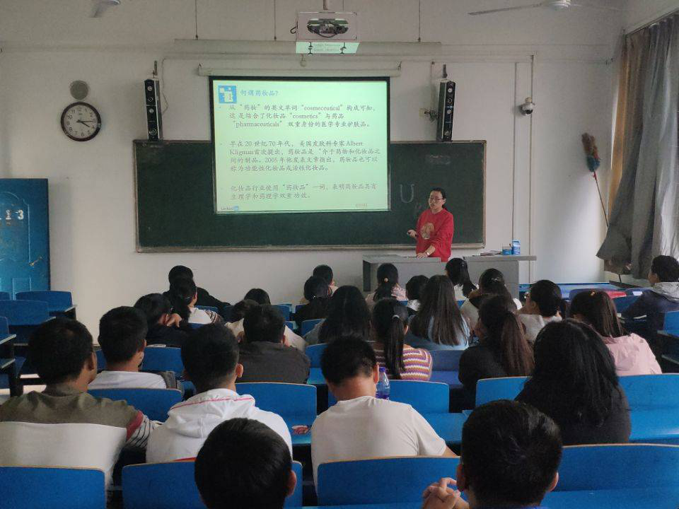 报告会首先由佟伟霜老师讲授。佟伟霜老师以同学们感兴趣的化妆品话题为切入点引领同学们进入主题,围绕“何谓药妆品”、“药妆品的功效、分类、原料及配方和开发流程”进行了一系列的分析与讲解,并展示了“药妆品”产业取得的成果。同学们认真听讲,并积极做笔记。