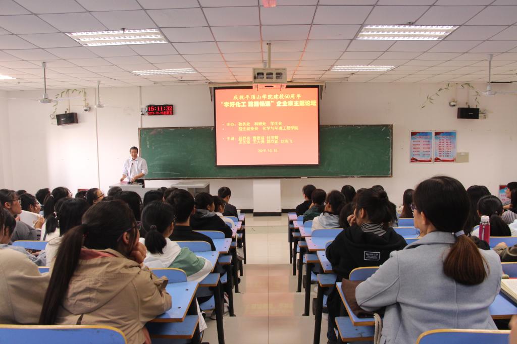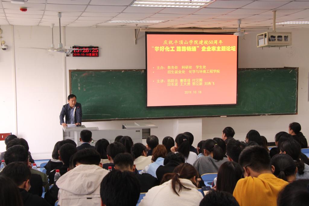 为庆祝平顶山学院建校60周年,由教务处、科研处、学生处、招生就业处、世俱杯中国官网入口共同主办的“学好化工 前路畅通”企业家主题论坛于10月18日下午在图书馆411教室举行。下午三点,活动正式开始,教室内座无虚席,过道、窗外听众爆满,来自化学工程与工艺、材料科学与工程等专业的200多名师生参加了活动。