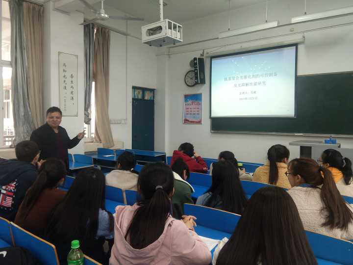 报告伊始,马威博士介绍了学科发展背景:能源危机和环境污染日趋严峻,迫切需要新兴技术改善这种局面。光催化技术是近年来迅速发展起来的可以利用太阳能进行环境净化和能源转化的新技术,是最有前景的新技术之一,其具有绿色、节能、安全、无污染等优点。接着马威博士向同学们展示了B-Ni-TiO2/g-C3N4复合光催化剂的制备及光降解性能研究,通过FT-IR和XRD分析与SEM和TEM分析检测到B-Ni-TiO2和C3N4复合能加速光生电子和空穴的分离,从而提高复合光催化剂的光催化活性。最后从光降解氯毒素机理研究方向向同学们展示了光催化剂的制备、表征及性能研究。报告会气氛活跃,同学们积极地与老师讨论,此次学术报告圆满结束。