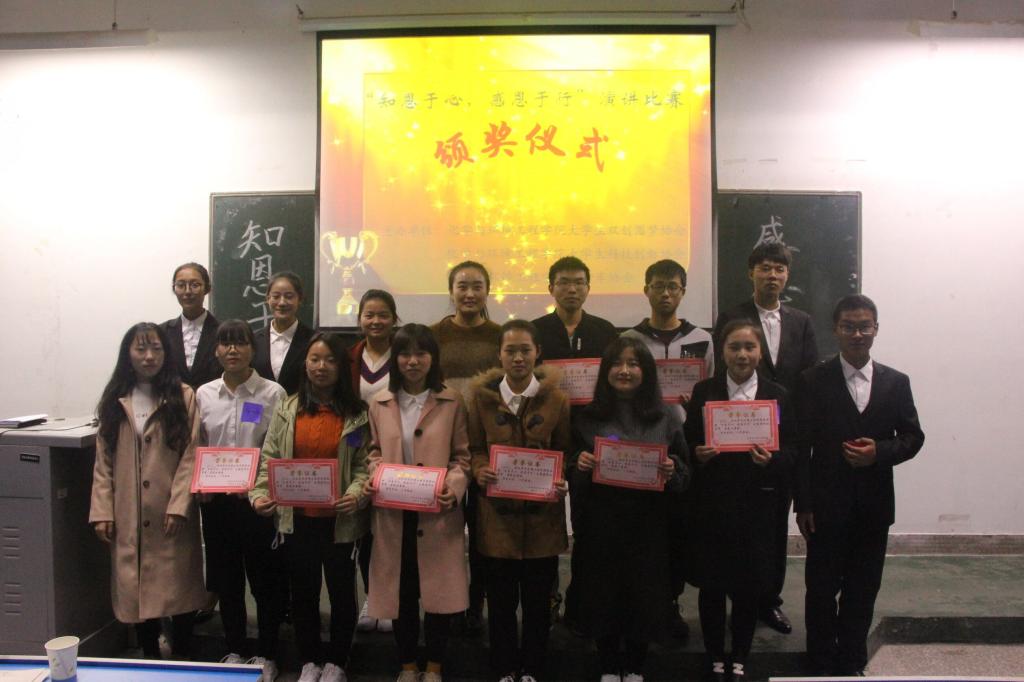 活动伊始,主持人宣布比赛正式开始并宣读比赛规则和评分细则。本次比赛24位参赛选手分为四组进行,选手们以感恩为主题展开了精彩的演讲,演讲内容有感恩祖国、感恩父母、感谢生命、感恩他人、感恩社会……同学们的演讲让在场的老师和同学感动不已,一个个感恩的故事如同一段动听的旋律,触动着观众们的心弦,赢得了观众们热烈的掌声。每组同学演讲结束后,还有激动人心的“抽奖大惊喜”环节,带动了现场活跃的气氛。参加比赛的选手充分准备的PPT加上他们精彩的演讲,让整个比赛现场处于一片温暖和感恩的氛围中。经过四轮激烈的角逐,大赛也接近了尾声,主持人宣布获奖名单。获奖选手为一等奖罗琳,二等奖董方圆、王佳博,三等奖周斌、裴慧铭、赖辛格,优秀奖宋亚囡、赵薇、张薇、姜景玉。此次演讲比赛在大家的掌声中落下帷幕。