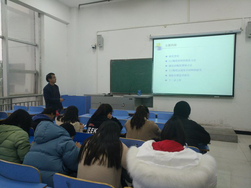报告会中,韩永军博士首先介绍了碳化硅陶瓷制备及性能的研究背景。紧接着,围绕“碳化硅陶瓷材料的制备方法”“碳化硅陶瓷增韧方法”“碳化硅陶瓷金属复合材料的研究”和“凝胶注模技术研究”四方面进行了专业知识的分析与讲解,并向同学们展示了下一步的研究工作。在“碳化硅陶瓷材料的制备方法”中,韩永军博士讲到,固相烧结碳化硅陶瓷材料的优点是无游离硅、无烧结液相、耐腐蚀和耐高温。报告会中同学们认真聆听,并积极做笔记。
