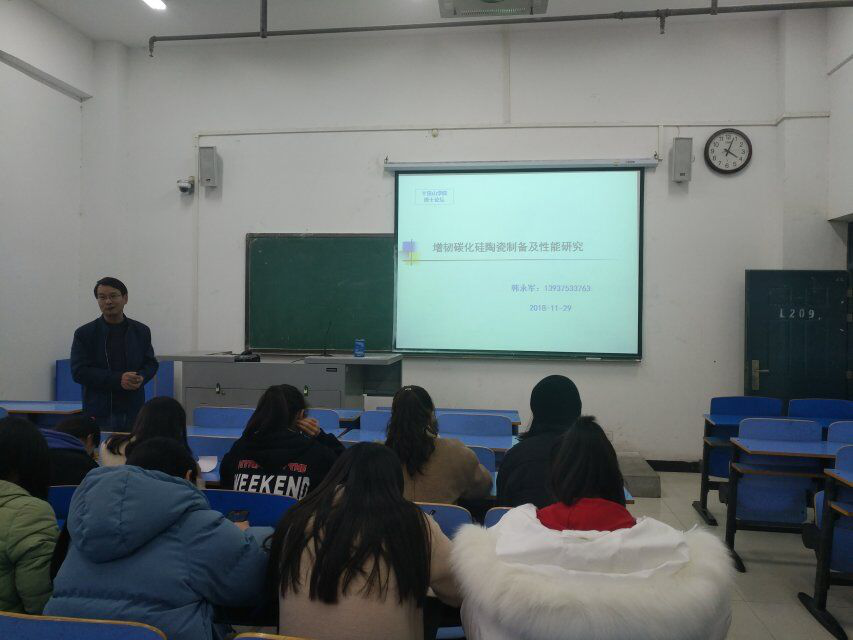 11月29日下午,世俱杯中国官网入口韩永军博士在L209进行了关于“增韧碳化硅陶瓷制备及性能研究”的学术报告。世俱杯中国官网入口18级化学1班、材料2班全体同学听取了此次学术报告。