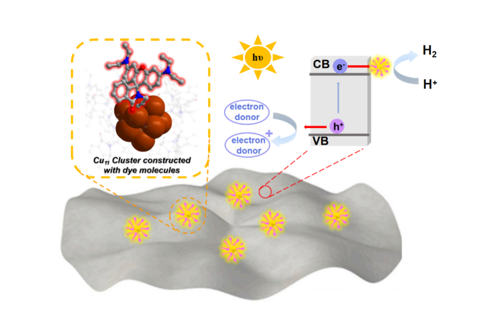 该研究首次利用罗丹明炔基配体构筑出一例光活性的11核铜(I)-炔基纳米团簇,由于罗丹明炔基配体的稳定和敏化作用,Cu11簇在光催化体系中表现出优异的质子还原能力,有效实现了光催化产氢,即使在没有贵金属助催化剂的情况下,该Cu11簇的光催化析氢活性达到了8.13 mmol g−1h−1。将Cu11簇沉积在TiO2纳米片表面时,又形成了一种高效的复合半导体光催化剂Cu11@TiO2,相比于Cu11和TiO2,该复合材料表现出更强的光电响应能力、更低的载流子迁移阻抗和更优异的质子亲和力,有效促进了光生电子和空穴的分离和迁移,其光催化活性比纯TiO2纳米片提高了60倍,且在光催化过程中表现出优异的稳定性。本研究不仅为染料配体保护金属纳米团簇的设计合成提供了有价值的参考,而且拓宽了金属团簇基复合材料的应用范围。