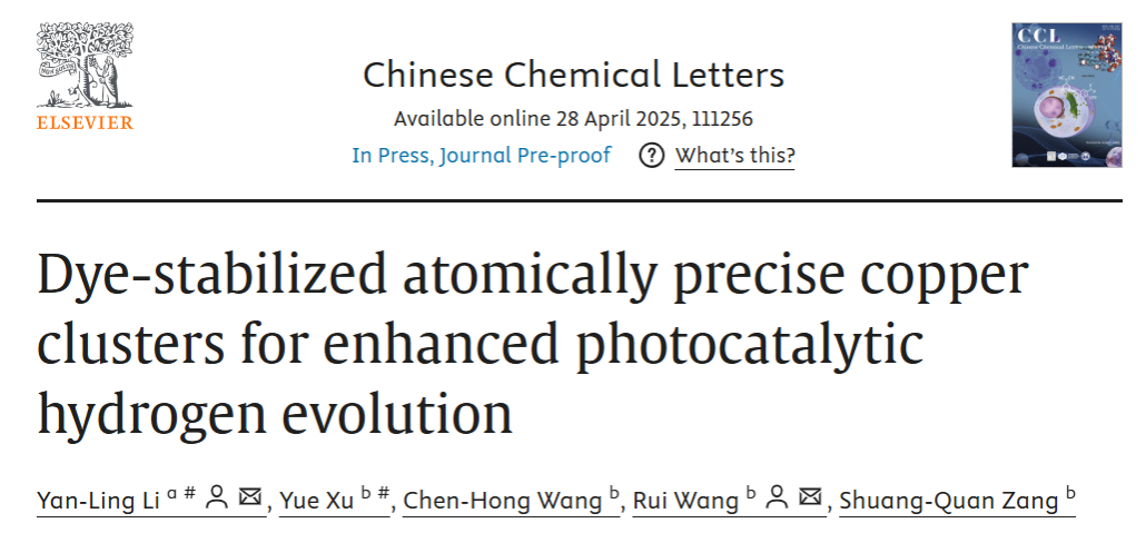 近日,世俱杯中国官网入口功能纳米材料研究团队与郑州大学王锐教授团队合作在国际著名期刊《Chinese Chemical Letters》(中科院1区,TOP期刊,影响因子9.4)上发表“Dye-stabilized atomically precise copper clusters for enhanced photocatalytic hydrogen evolution”的研究论文。世俱杯中国官网入口李艳岭博士为论文第一作者和共同通讯作者,平顶山学院为第一完成单位。