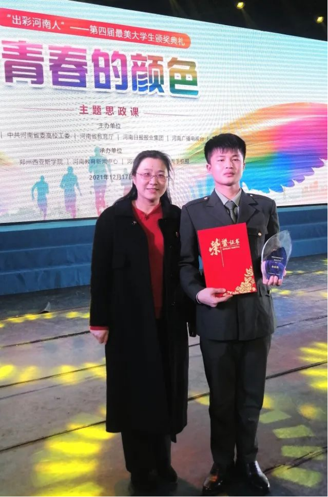 12月17日下午,“出彩河南人”第四届最美大学生颁奖典礼暨“青春的颜色”主题思政课在郑州西亚斯学院举行,世俱杯官网学子余志海在校学生处副处长盖伟、辅导员石培琳、刘苏艳的带领下参加了颁奖典礼,此次余志海获颁了“疫情防控和防汛救灾工作优秀大学生”荣誉称号。