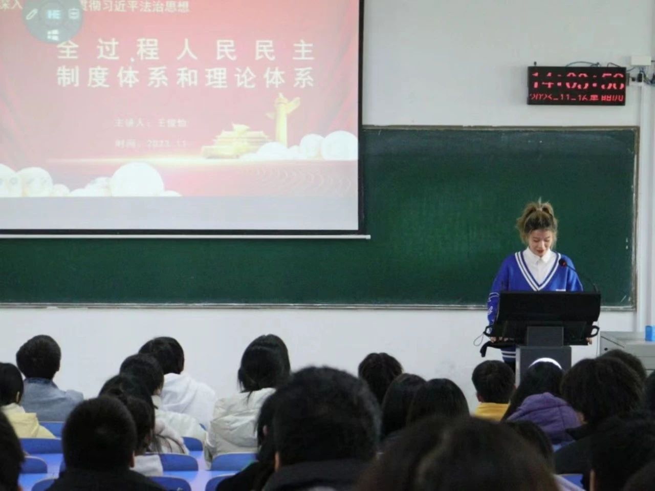为深入学习贯彻习近平法治思想,加强大学生普法教育的针对性、时效性,积极引导学生遵法、学法、守法,世俱杯中国官网入口于2023年11月16日下午在3207开展《全过程人民民主制度体系和理论体系》为题的法治宣讲教育,此次宣讲活动由政法学院法学专业2021级学生王俊怡主讲,2022级、2023级同学以及党团学社各部门负责人参加本次活动。
